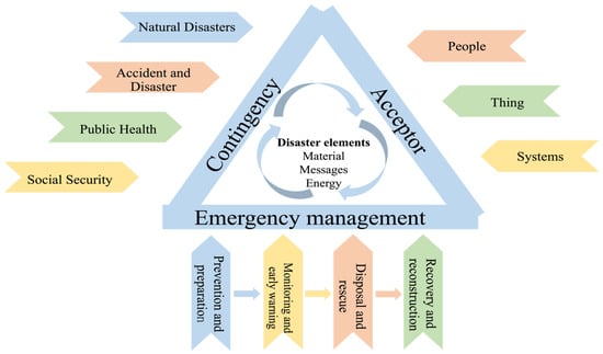 Among them, the actions that lead to the occurrence and generation of contingencies are called “disaster elements”, which specifically include material, energy and messages []. Acceptor refers to the time of occurrence of contingencies, people, things or systems and other objects subject to the role of contingencies, with ontological damage and functional damage, respectively, manifested in the vulnerability and robustness of acceptors []. Emergency management refers to the process of taking countermeasures [], divided into four main aspects: prevention and preparation, monitoring and early warning, disposal and rescue, recovery and reconstruction, corresponding to the crisis life cycle theory first proposed by Fink in the book Crisis Management: Planning for the Inevitable in 1986. The entire emergency management process plays a role in effectively preventing emergencies and their catastrophic consequences from harming the public [].