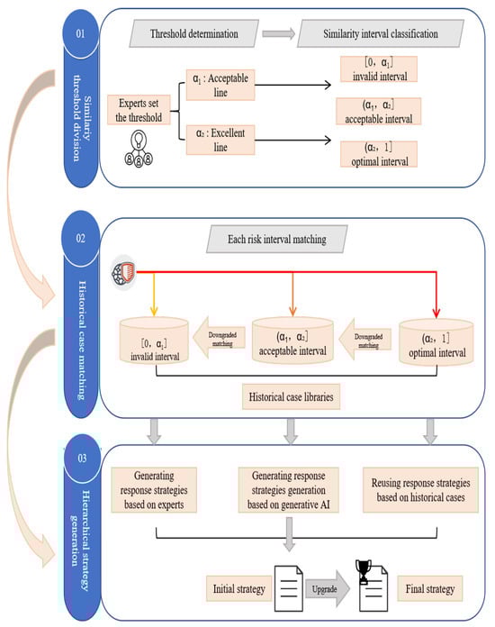 The CBR method is based on the strategy of using the most similar historical cases to solve the target case []. However, in general, due to the fact that events may differ from each other to a different extent, the retrieval results of some historical cases cannot be directly applied to solve the current risks [], and it is necessary to formulate reasonable and scientific modification rules to reprocess the response strategies of historical cases. Based on numerous scholarly studies [,,], this paper introduces generative AI into the case revision process to improve the rationality and applicability of response strategies. The specific operation steps are shown in Figure 3.