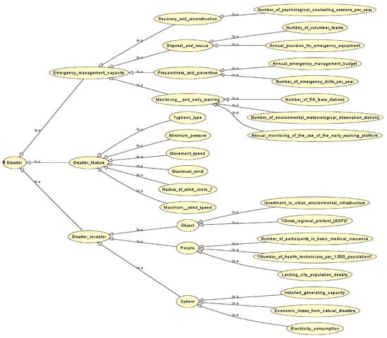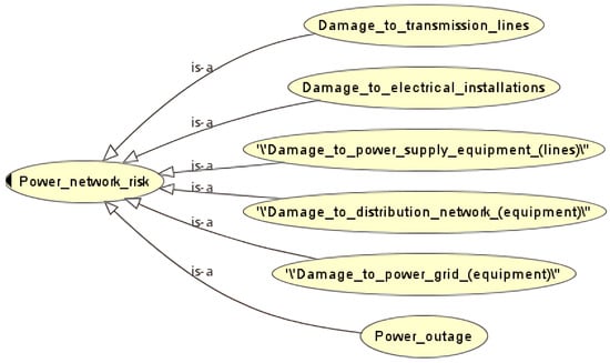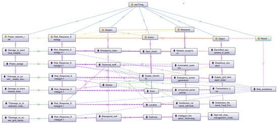 The concept of ontology originally originated in the field of philosophy, where it was defined as “a systematic description of objective things in the world”, i.e., “existentialism”. Later, Gruber defined ontology as “a clear specification of conceptualization” that facilitates the integration and sharing of knowledge []. It enables us to construct disaster cases with domain knowledge and to reuse this knowledge as a whole []. Typically, ontologies are categorized into four types []: top-level ontologies, domain ontologies, task ontologies, and application ontologies. Among them, the top-level ontology mainly studies the relationship between concepts. Domain ontology studies the connection between concepts within a specific domain. Task ontology is used to express the connection between concepts within a specific task. The application ontology is used to describe some specific applications, which can refer to concepts in the domain ontology as well as concepts appearing in the task ontology. Within an ontology, there are five main elements: classes, relations, functions, axioms, and instances. This study uses Protégé software [], a scenario-based ontology case representation, where all historical cases and target cases are represented as ternary groups (i.e., incident attribute descriptions, risk network descriptions, and response strategy descriptions).