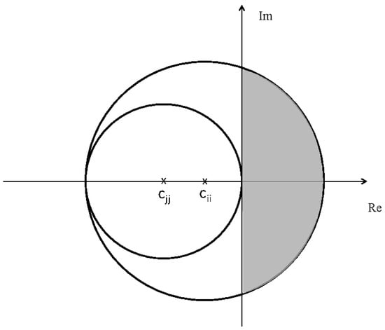 With this algorithm, one can generate coupling matrices with mixed positive and negative values. An interesting observation is that the Gershgorin Theorem is used to localize the eigenvalues of the connectivity matrices, in the sense that the spectrum of the matrix C is fully contained into the union of the Gershgorin disks . Let be the closed disk centered at with radius ; therefore, every eigenvalue of C lies within at least one of these disks . However, for the proposed method, some of the radius are greater than the absolute value of the center . As a result some regions of the union of the disks lie in the right-hand said complex plane, as illustrated in Figure 1. For stability analysis, however, this information alone is not sufficient.