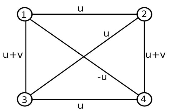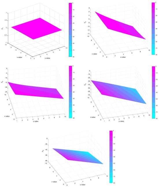 for this example, there are two nodes negatively coupled, and the rest of the nodes are positively connected. The eigenvalues of this matrix are and , which clearly are negative and one is zero. The behavior of the eigenvalues for and are illustrated in Figure 2, where it is evident that one eigenvalue is equal to zero and the rest of the eigenvalues are in general negative, note that as the values of u and v increases the eigenvalues decrease.