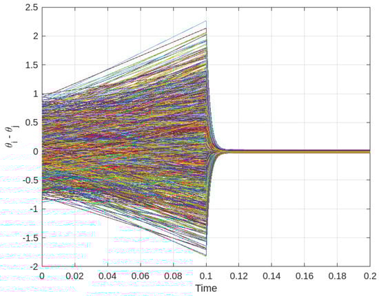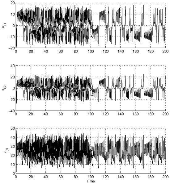 Now, with this network configuration, the systems were initially unconnected, that is, they exhibited free behavior until time , when the interconnection was activated according to the connectivity matrix. The chosen values for v and u are such that the eigenvalues of the Laplacian signed coupling matrix C are , , , and . Figure 5 illustrates the synchronization of the network of Lorenz systems. As can be seen, synchronization is maintained despite the presence of negative coupling values. Moreover, the synchronization between systems is in-phase; therefore, the negative couplings do not induce anti-phase or unstable synchronization. Moreover, the spectral structure of the signed Laplacian matrix is by design that it has only one zero eigenvalue, and all others are negative. This guarantees that the modes transverse to the synchronization state are stable, as required by the master stability function criterion. The second largest eigenvalue, in particular, plays a key role, the more negative it is, the faster the synchronization process will be. In the numerical examples, values such as or indicate strong and robust convergence. Figure 5 illustrates the synchronization of chaotic Lorenz systems, whose individual dynamics present non-periodic trajectories that are sensitive to initial conditions. The convergence of the individual trajectories to common trajectories, even starting from different initial conditions, is evidence of chaotic in phase synchronization.