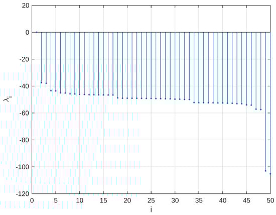 For this example, a network with oscillators is considered, where denotes the oscillator, is its natural frequency chosen randomly, and . The 50 eigenvalues for and are plotted in Figure 6 and it can be observed that all eigenvalues are negative except .