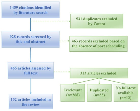 The inclusion criteria for literature selection were as follows: (1) any article that addresses port scheduling optimization; and (2) papers published between 2000 and 2025. Exclusion criteria included the following: (1) articles discussing and analyzing scenarios outside of port seaside operations; (2) papers unrelated to port scheduling optimization problems; and (3) books and review articles.