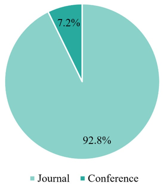 To comprehensively understand the current research status and development trends of port seaside scheduling problems, a systematic statistical analysis was conducted on the types, research scenarios, and temporal distribution of the collected literature. As shown in Figure 2, journal articles account for 92.8% of the total literature, while conference papers make up 7.2%. Among them, journal articles represent the overwhelming majority.