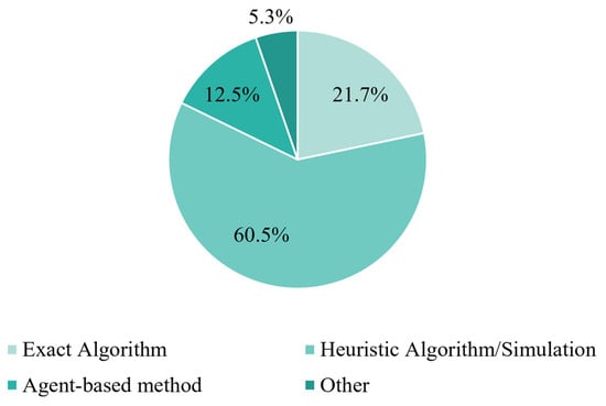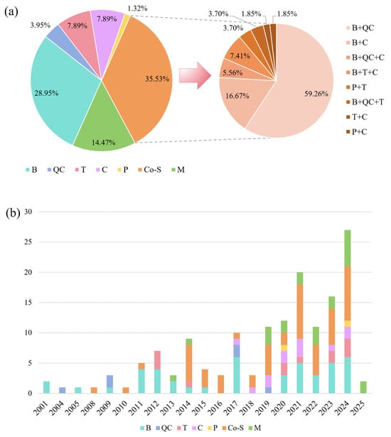 As shown in Figure 3a, the pie chart on the left presents the distribution of different resource types in current research on port seaside scheduling. It can be observed that the berth allocation problem (BAP) still holds a dominant position, accounting for a large proportion of single-resource scheduling studies and remaining the main focus in the literature. In contrast, research involving auxiliary resources such as tugboats (T), pilots (P), and channels (C) remains relatively limited and is still in its early stages of development. In recent years, there has been a notable increase in studies on coordinated scheduling (Co-S) and multi-resource scheduling (M), reflecting a growing emphasis in the field on complex resource coupling and systematic optimization.