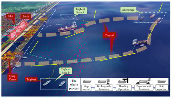 Based on the layouts and vessel inbound and outbound procedures documented for actual ports in the literature—including Tianjin Port [,,], Shanghai Waigaoqiao Port [], Tangshan Jingtang Port [,], Zhoushan Port and Rotterdam Port [], Singapore Port [,], Guangzhou Port [], and Bofa Port []—the following general process for vessel entry and departure can be summarized.