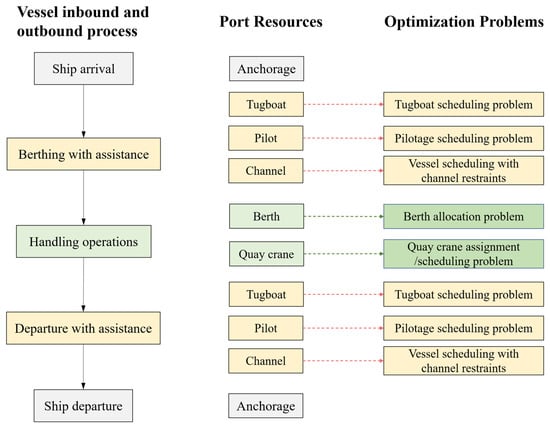 To further clarify the overall structure of port seaside operations, Figure 5 presents a comprehensive block diagram that maps the entire vessel inbound and outbound process, associated port resources, and corresponding optimization problems. This visualization provides an integrated perspective on the coordination of tugboats, pilots, channels, berths, and quay cranes, alongside the scheduling challenges inherent in each phase.