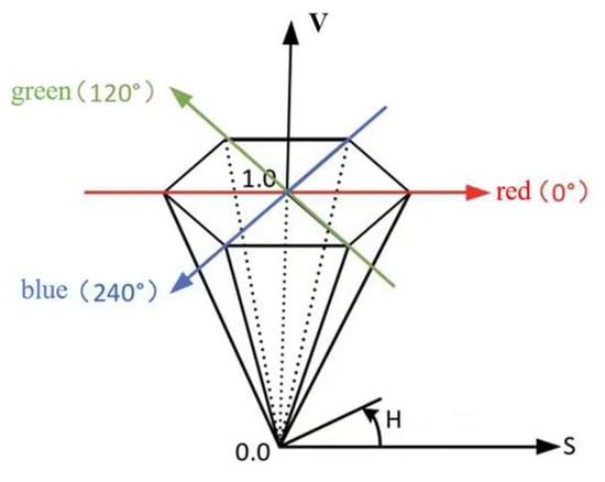 - Hue [,]: It demonstrates that in addition to the RGB color space, other color spaces can also be used for the pulse extraction because the transformed color space may eliminate some optical interferences. The HSV color space is one of them, in which H stands for hue, reflecting what kind of spectral wavelengths the color is closest to, S stands for saturation, and V stands for luminance. This model is schematically shown in Figure 1.