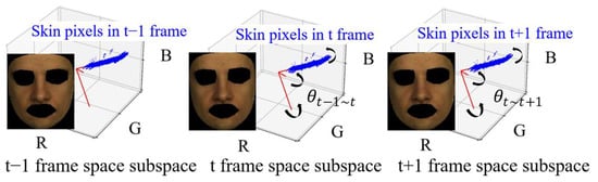 Figure 2. The SSR algorithm constructs a spatial subspace (represented by red feature vectors) using all skin pixels (blue pixels) in each frame, and calculates the angular variation between adjacent frames (e.g., representing the angle change between the spatial subspaces of frame t − 1 and frame t). - Synthesizing these numerous algorithms and exploring their underlying principles will facilitate the optimization of pulse signal extraction algorithms, which is a crucial research direction. Despite the wide variety of existing algorithms, the distribution of noise and pulse signals in RGB signals remains poorly defined, and a common challenge remains in developing a robust color space model that can adaptively and effectively suppress noise, which is the primary focus of this work.