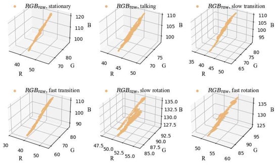 Besides the skin tone and the illumination variation, motion also has a significant impact on the specular component in the skin-reflection models. To investigate the influence of general noise on the RGB signals without considering the specific noise type, the distribution of RGB signals (denoted as RGBraw) extracted from a set of tested videos from the dataset PURE [] is plotted in Figure 3. PURE primarily includes videos featuring stationary subjects, conversations, and head movements such as translations and rotations. Figure 3 shows the results of subject 1 in different statuses from PURE. To obtain the desired RGB signals, the skin pixels of each frame are first averaged to calculate the mean value for each frame. These mean values are then concatenated in the time domain to form the RGB sequences. The data in Figure 3 demonstrates approximately linear or spindle-shaped distribution. Given the inherently weak amplitude of the BVP signal, it can be assumed that the major variations along the spindle’s long axis, which represent the primary temporal changes of the signal, are attributable to noise from motion or lighting variations. These changes negatively impact the extraction of the BVP signal.
