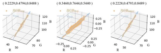 The statistics shown in Figure 3, Figure 5 and Figure 6 are computed over the entire video clip. For longer videos with complicated motion, the noise present in the signal may exhibit a more dispersed pattern across multiple directions, as illustrated in the “Slow-rotation” and “Fast-rotation” cases of Figure 3. However, the proposed Plane-Orthogonal-to-Noise is designed to be perpendicular to the dominant noise direction. In practice, a sliding window of frames is employed to estimate the noise vector vnoise and determine the APON in real time. The selection of sliding window size and hop size will be declared in detail in the experiments section. The least squares method is employed to fit the RGB scatter to a straight line. The 3D spatial straight line fitting approach involves deriving the fitted line from the intersection of two planes, which is achieved by solving the equations describing these planes in 3D space. Details of the derivation process could be found in [].