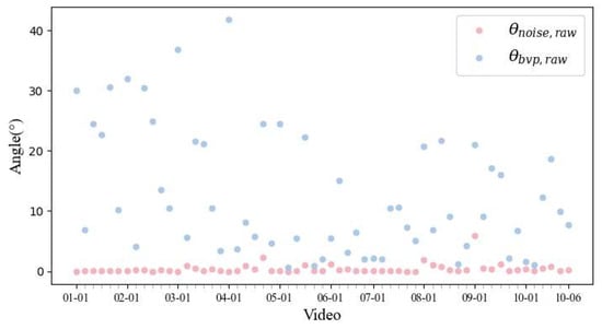 The RGBraw, RGBbvp, and RGBnoise of the first video (stationary) from Figure 3 are shown in Figure 5. The scatters are fitted to straight lines using the least-squares method []. As shown in the figure, the corresponding vectors vnoise and vraw nearly coincide. On the other hand, the angle between vbvp and vraw is far from zero. Besides, the variation range of RGBnoise is close to that of RGBraw, which is about 65~85 in the Green channel. While the variation due to BVP is much smaller and constrained in [−0.4, 0.4]. The angles between vnoise, vbvp, and vraw are plotted in Figure 6 for the whole dataset. The statistical results confirm the hypothesis that the direction of the dominant color variation in the RGB space is due to noise, regardless of whether the target is stationary or undergoing different motions.