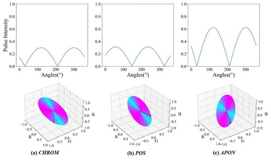 Distribution of pulse intensity on the projection planes (a) CHROM, (b) POS, (c) APON in PURE “01-01”. The pulsatile vector is defined by the upbv [0.33, 0.77, 0.53]T of PBV []. Red means high pulse intensity, and blue means low intensity in the contrast.