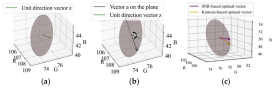 Before determining the final vector in the plane, let us confirm “Is APON a better plane?” First, assume the pulsatile vector is defined as [0.33, 0.77, 0.53]T in PBV []. Figure 7 visually compares the pulse signal distribution on the planes corresponding to the CHROM, POS, and our proposed APON methods. This figure demonstrates that the pulse signal is significantly stronger on the APON plane. Besides, an evaluation experiment was conducted to compare the optimal vector in this plane with the plane used in existing approaches. All the possible projection vectors within the planes were extracted by exhaustive search with a 1-degree interval, as depicted in Figure 8b. Then, RGB signals were projected onto each vector to get their corresponding projected signals, which were evaluated against the reference PPG signal. Four metrics, namely Root Mean Square Error (RMSE) [], Concordance Correlation Coefficient (CCC) [], Accuracy (ACCURACY) [], and Signal-to-Noise ratio (SNR) [], were utilized to evaluate the performance of the final projected signals in calculating pulse rate.