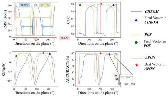 A typical video in Steady state from PURE is used as an example in Figure 9. It shows the evaluation results of the corresponding projection signals obtained from the exhaustive 360 vectors with the adaptive projection plane (green), the results from the CHROM plane (blue), and the POS plane (orange). It is reasonable to observe that the results of the three projection planes exhibit a periodicity of 180 degrees. Hence, only half of the plane is considered in the subsequent analysis. Each evaluation metric has a relatively good performance range, which is consistent across multiple metrics. It could be found that 48.89% of the vectors provide relatively small RMSE values in the CHROM plane, while the percentage is 81.11% for POS, and 86.67% for APON. The wider the range, the easier it is to find the best vector. Moreover, the figures in CCC, SNR, and ACCURACY metrics also show the superiority of the optimal vector obtained in APON over the vector of CHROM and POS. Generally, the proposed APON not only provides a wider good performance range for the vector tuning in the next step, but also contains an optimal vector with better performance than state-of-the-art algorithms.