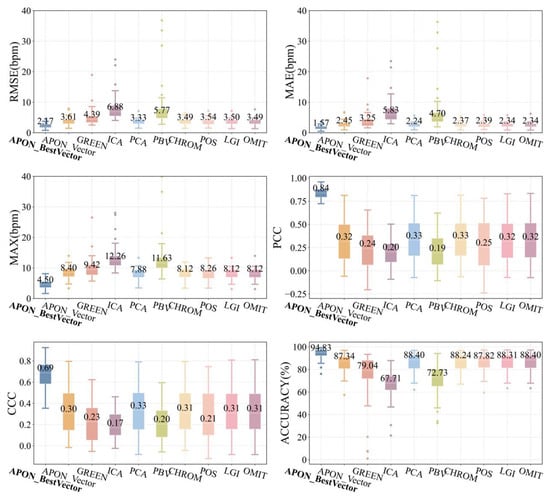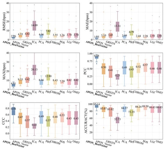 Figure 12 shows the comparison among various algorithms, including projection to the optimal vector on the adaptive plane APON_BestVector, the proposed APON_Vector, and other spatial vector projection methods listed in Table 1. It can be observed that the APON_BestVector outperforms the results of other algorithms in terms of different metrics (2.17 bpm, 1.57 bpm, 4.5 bpm, and 94.83% for RMSE, MAE, MAX, and ACCURACY, respectively), particularly in PCC (0.84) and CCC (0.69). The proposed APON_Vector significantly outperforms GREEN, ICA, and PBV algorithms, while having similar performance with others in terms of RMSE (3.61 bpm), MAE (2.45 bpm), MAX (8.40 bpm), PCC (0.32), CCC (0.30), and ACCURACY (87.34%). As depicted in Figure 13, the performance comparison on the UBFC2 shows a similar trend to the PURE, further validating our approach.