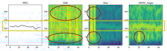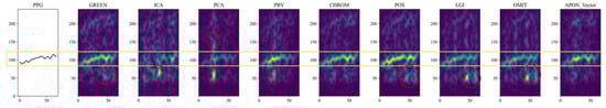 The comparison of the APON_Angle with other spatial angle projection algorithms, SSR, and Hue, is shown in Figure 15. It is found that the SNR of Hue and SSR is relatively low for pulse extraction. In contrast, a clear frequency trace could be observed in the proposed scheme. As shown in the time-frequency analysis of Figure 14 and Figure 15, the APON method effectively filters out noise and artifacts (red circle), yielding a cleaner pulse signal (yellow rectangle). This visual evidence directly accounts for our method’s superior performance in the comparative analysis.