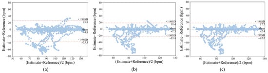 Bland–Altman analysis of the agreement between reference heart rate values and estimated heart rate values obtained from (a) SSR, (b) Hue, and (c) APON_Angle (a total of 2776 measurement pairs). The lines represent the mean and 95% limits of agreement.