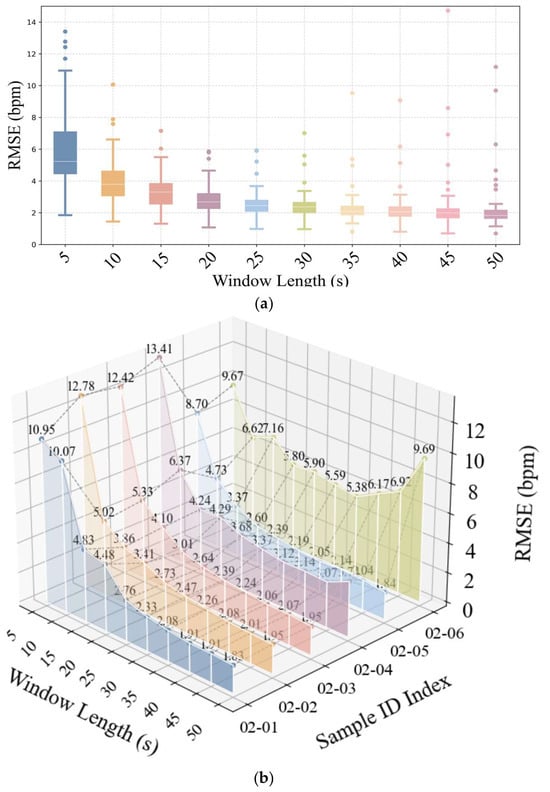 As mentioned in Section 3.2, the noise in the signal may exhibit a dispersed pattern across multiple directions when the video duration is long. A sliding window of frames is employed to estimate the noise vector vnoise and determine the APON in real time. In this section, the experiments were conducted in PURE for the discussion of APON_Vector with different segment lengths. Results were collected for segment lengths ranging from 5s to 50s with a step size of 1 s, as shown in Figure 17. It can be observed that as the length of the tested video segments increases, the average RMSE of pulse rate gradually decreases. While the decreasing trend becomes less significant between 25 s and 50 s. Besides, the results for subject 02 were included in Figure 17b to demonstrate the effects in different video types. For the stationary videos, e.g., 02-01, a longer window means more values for determining the dominant noise direction and the adaptive plane, and results in more accurate pulse rate detection. While for video 02-06, which contains different noise directions across the timeline, the fitting vector is no longer dominant, and the performance of the projection plane varies when the window length keeps increasing. Considering a balance between accuracy and real-time requirement, the segment length of 20 s to 30 s is suggested in the proposed method for different videos. The determination of the APON plane primarily involves fitting a line to the RGB data points within a sliding time window. This fitted line is then used as a normal vector to define the plane orthogonal to it. With a recommended sliding window of 20 to 30 s, this method is computationally efficient and fully capable of meeting the requirements for real-time heart rate detection, as it only requires a line fitting and plane calculation on the most recent window of data.