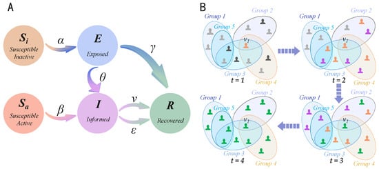 Unlike traditional face-to-face communication, information diffusion in online social networks typically relies on higher-order interactions within social groups [28,29,30]. To realistically simulate this process, our team introduced hypergraphs [31,32,33] to model multi-way user interactions and proposed the information diffusion model [20]. Figure 1 illustrates the model’s state transitions and corresponding diffusion process in the hypernetwork. Building on classical epidemic models while incorporating online user behaviors, this model refines the Susceptible state (S-state) into two substates: Susceptible Active (-state) and Susceptible Inactive (-state). It retains the Exposed (E-state), Informed (I-state), and Recovered (R-state) states. The E-state denotes users who have received the information but have not yet begun to disseminate it; they may later transition to the I-state to start spreading, or enter the R-state to cease diffusion behavior. The I-state represents users who are aware of the information and are actively disseminating it within the online social network. The R-state refers to users who are aware of the information but no longer engage in its diffusion.