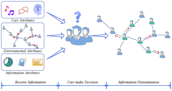 Factors influencing information diffusion. During the information reception stage, a user’s attitude toward the information is determined by user attributes, environmental attributes, and information attributes. After receiving the information, the user makes a decision based on a comprehensive consideration of these three types of factors. If the user chooses to disseminate the information, it will be further propagated across the network, thereby influencing other users.