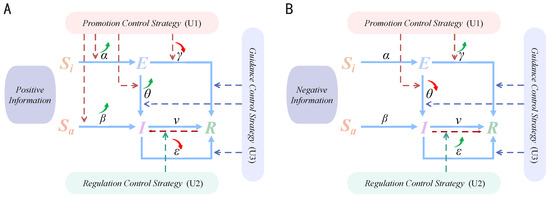 A schematic diagram of the working principles of the information control strategies. (A) The state transition probabilities under the influence of the three control strategies in the context of positive information; (B) the state transition probabilities under the influence of the three control strategies in the context of negative information. The green upward arrows indicate an increased probability under the effect of control, while the red downward arrows indicate a decreased probability under the effect of control.