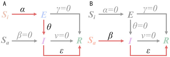 - Transition from -state to E-state: When a node in the -state is adjacent to a node in the I-state, it transitions to the E-state with probability .