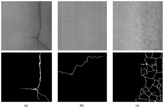 Examples of crack categories based on width and contrast in digital images ((upper): 3D images; (lower): ground truth). From (left) to (right): (a) cracks with width greater than 2 pixels (thick cracks), (b) cracks with width equal to or less than 2 pixels (thin cracks), and (c) cracks with poorly defined edges due to weak range contrast (low-contrast cracks).