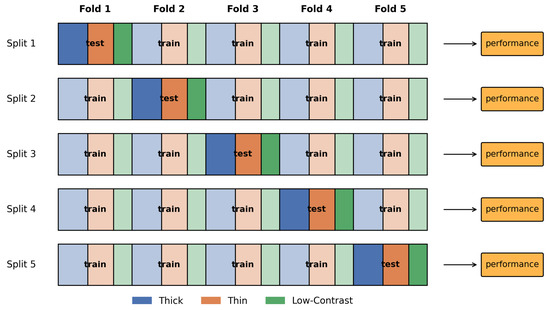 In this study, we evaluated the models using a stratified five-fold cross-validation scheme. The constructed 3D dataset was first partitioned into five equal-sized folds while maintaining the original distributions of thick, thin, and low-contrast cases. For each split, one fold served as the test set and the remaining four folds were used for training (Figure 3), ensuring that every sample was used for validation exactly once. Because the category proportions are preserved within each fold, stratified cross-validation avoids bias caused by imbalanced class labels and yields more solid validation of the models. After each split, we recorded the evaluation metrics, and the results reported in the following sections are the averages across all five test folds. To examine whether the observed improvements by our proposed method were statistically significant, we performed paired t-tests on the per-fold performance scores of the proposed approach versus the baseline methods; the resulting p-values were used to decide whether the improvements were statistically significant.