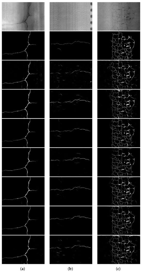 Precision, Recall, and F1-score are widely used to assess the classification behavior of deep learning models. Precision refers to the proportion of true positive predictions among all predicted positives, while Recall indicates the proportion of true positive predictions among all actual crack pixels. An F1-score provides a harmonic mean of Precision and Recall. The expressions of these three metrics are shown in Equations (1)–(3), where tp denotes the number of true positive pixels, fp denotes false positives, and fn denotes false negatives:
