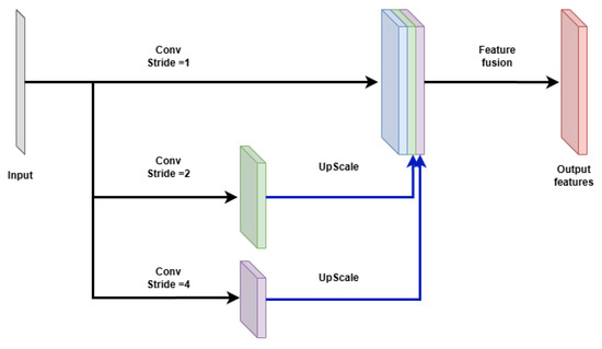 The high-resolution stream processes the input directly, using a 3 × 3 convolution with stride 1 to preserve fine spatial detail. The medium-resolution stream first downsamples the input, using a 3 × 3 convolution with stride 2, and it then applies another convolutional block to extract mid-level features. Similarly, the low-resolution stream applies a 3 × 3 convolution with stride 4 followed by another convolutional block to capture broader contextual information. The outputs from the three streams are then upsampled (where necessary) to match the highest resolution and concatenated along the channel dimension. A final 1 × 1 convolution is applied to fuse the features and reduce dimensionality. The fusion can be expressed using Equation (6):
