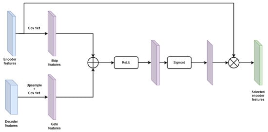 The attention mechanism follows a gating strategy to refine skip connections during feature fusion. Specifically, the attention gate takes two inputs: (1) the gating signal from the decoder (upsampled feature), and (2) the corresponding encoder feature map (skip connection). Each input is passed through a separate 1 × 1 convolution and batch normalization layer to unify their channel dimensions and project them into an intermediate feature space. The two transformed signals are added element-wise, activated by ReLU, and further processed by a third 1 × 1 convolution followed by a sigmoid activation to generate the attention map. This attention map is then applied element-wise to the encoder feature map x, allowing the network to selectively focus on informative spatial regions. The equation can be expressed as