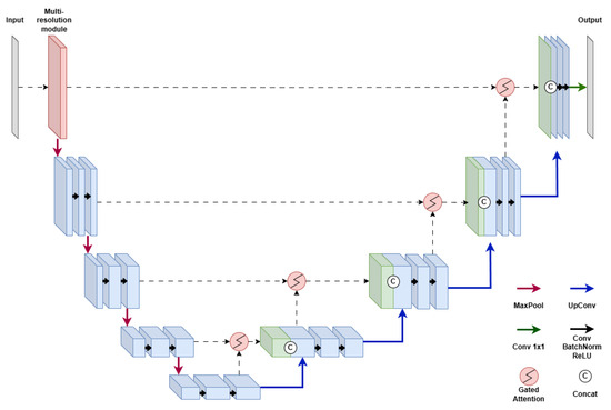 In this study, we adopted U-Net as the base architecture, given its reliable performance and clean encoder–decoder topology. The prior results indicated residual errors on thin and low-contrast cracks, motivating enhancements that preserved fine detail and suppressed background noise. Accordingly, we augmented U-Net with (1) multi-resolution feature extraction and (2) attention-guided skip fusion, which together target finer structure recovery and more selective feature aggregation.