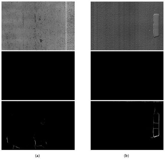 This study has two primary limitations. Firstly, the dataset is comparatively small (356 tiles); for thin and low-contrast cracks, pixel-accurate ground truth is inherently ambiguous. While our results on CrackTree260 and CRKWH100 provide external evidence, broader validation on larger and more diverse datasets is needed. In addition, for 3D pavement surface imagery, sensor resolution is a key acquisition parameter: the same physical crack can appear markedly different at different spatial samplings. Accordingly, it is necessary to assess the effectiveness of the proposed method across datasets and sensors with varying resolutions. Secondly, despite the overall gains, the performance on thin and low-contrast cracks remained modest. Figure 8 shows two typical failures found in the test. Figure 8a shows an image with no crack, where the model falsely predicted parts of the pavement texture as cracks, likely because those texture features lay between the background and low-contrast crack distributions learned from the dataset. Figure 8b shows “cracks” along lane markings that were misclassified as actual cracks, plausibly due to insufficient negative/edge cases for lane-mark artifacts. These issues also suggest a need for larger, more diverse training data and better consensus masks to reduce false positives in visually ambiguous regions.