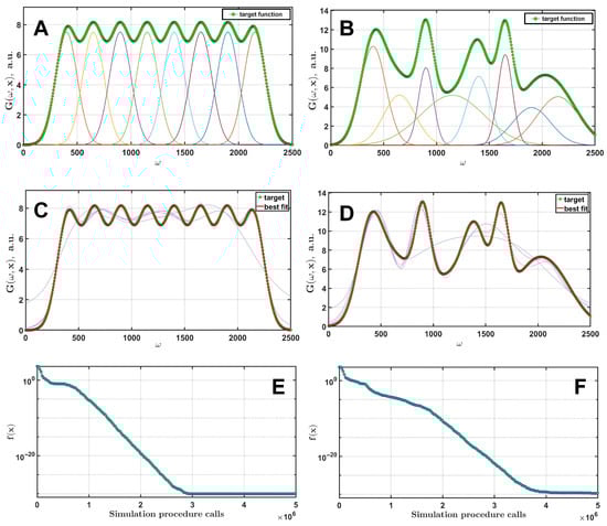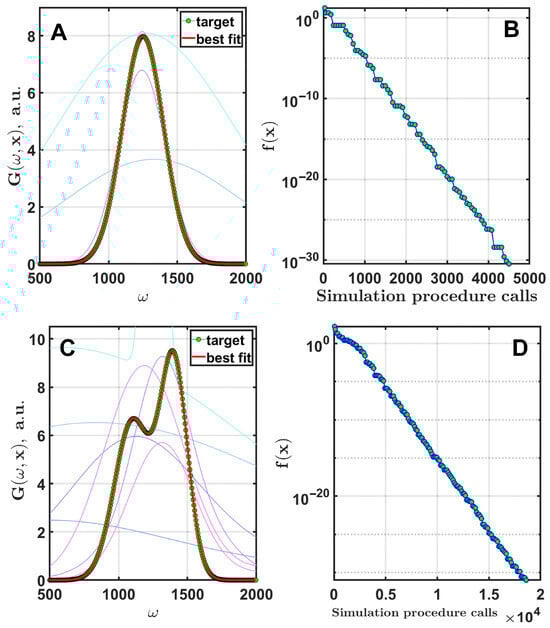 Let us now evaluate whether EGD can achieve an acceptable result for a combination of multiple Gaussians. In Figure 3, the fitting results of the simulated spectra using eight equidistant identical Gaussian functions (A) and the eight different Gaussians (C) are presented. The Gaussian parameters are given in Table 1. The DE/rand/1/bin strategy was used, with  and  for the equal frequencies set, and  and  for the unequal set. The number of generations was 10,000 for both cases. The corresponding dynamics of the cost function are shown on the right.