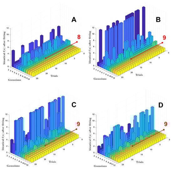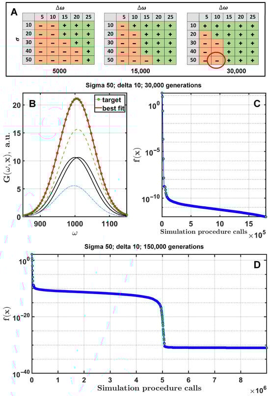 Based on the panels of Figure 2A, it can be seen that the wider the distance between the peaks, and the narrower their width, the easier it is for the algorithm to find the specified Gaussians. As can be seen, in the vicinity of 75,000 generations (450,000 simulation procedure calls) the algorithm finds the correct solution, resulting in the target function moving towards machine epsilon (~10−32). Therefore, 150,000 generations were sufficient for the algorithm to accurately determine two closely located Gaussians. At some point, the cost function starts to converge rapidly towards machine epsilon.