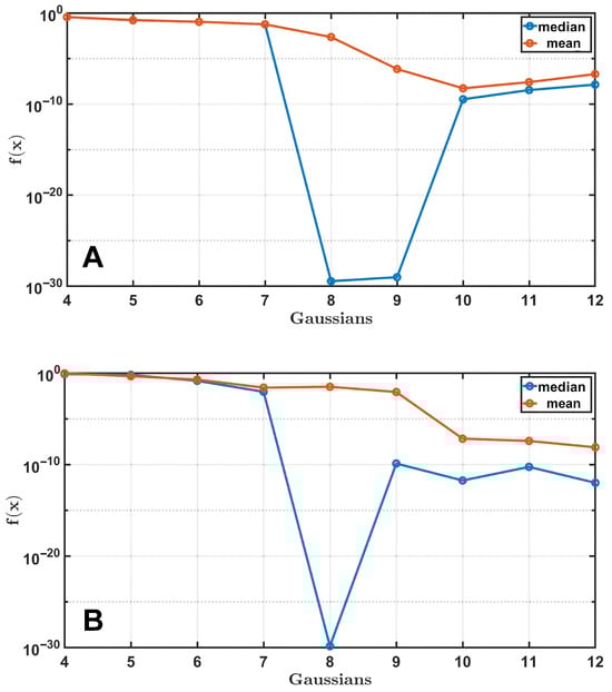 To determine the optimal number of Gaussian functions for the synthetic spectrum, calculations were performed where the fitting was performed using different combinations of Gaussians with the number of functions varying from 4 to 12. The number of independent runs was 25, and the results for medians and means are shown in Figure 4.