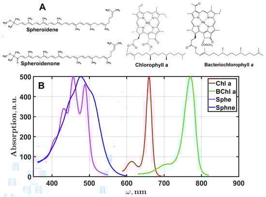 In order to extend the applicability of the EGD algorithm for fitting experimental data, simulations were made for absorption spectra of chlorophyll a, bacteriochlorophyll a, spheroidene, and spheroidenone []. The chemical structure of the studied pigments and their absorption spectra are presented in Figure 5. An additional challenge of such modeling is the unknown optimal number of Gaussians, which requires the development of a certain criterion for the fitting procedure. Taking into account the results of the preliminary simulations, the process for determining the optimal number of Gaussians for the experimental data can be algorithmized as follows.
