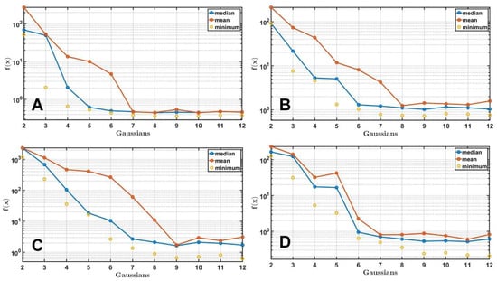 The main feature of EGD is its analysis of the statistics of reaching local minima (see Figure 7). EGD calculates the number of times optimization completes with the same objective function values. By comparing the mean, median, and minimum values of the objective function, we conclude that analyzing the statistic of local minima can be useful for determining the optimal number of Gaussians in a decomposition.