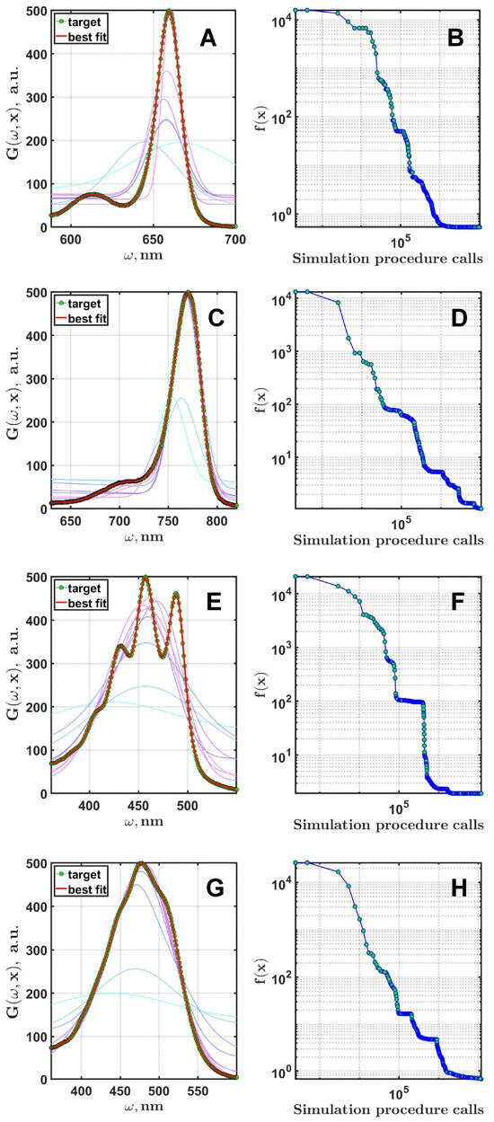 The results of the fitting for Chl a (A), BChl a (C), spheroidene (E), and spheroidenone (G). The thin lines indicate the best spectra after first seven generations of the optimization process. The corresponding convergence dynamics are shown in (B,D,F,H) on logarithmic scales.