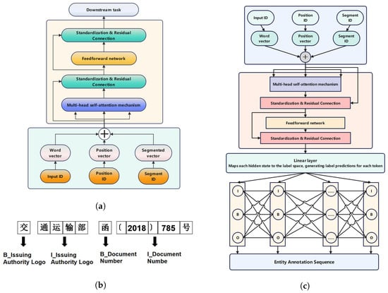 Overall diagram of BERT, CRF, and BERT-CRF model architectures. (a) Schematic diagram of the BERT model. (b) Example of an entity annotation sequence for the Chinese text “交通运输部函〔2018〕785号” (Ministry of Transport Letter, No. 785 (2018)). (c) BERT-CRF model architecture diagram.