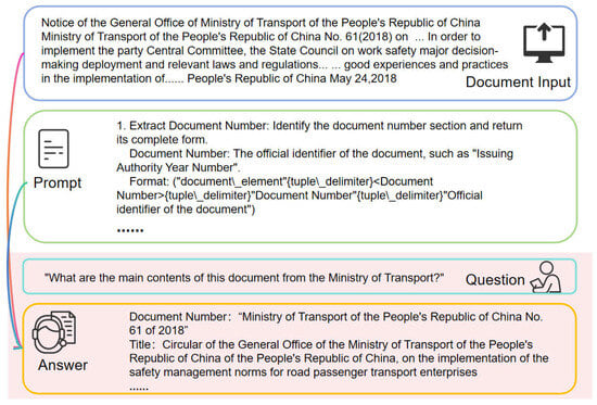 Prompt engineering diagram illustrating the overall workflow from document input to final answer generation. The ellipses (…) in the example text indicate that the content has been abbreviated for illustrative purposes.