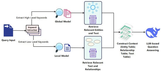 Enhanced retrieval process diagram, showing keyword extraction followed by parallel retrieval from both global (KG) and local (document) models.