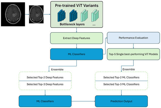 Proposed double ensemble architecture for brain tumor MRI classification. The framework integrates hierarchical ensembles of deep feature representations extracted from multiple pre-trained ViTs and ML classifiers. Combining the outputs of top-performing feature extractors and classifiers enhances predictive accuracy and robustness, improving the differentiation between normal and abnormal brain MRIs.