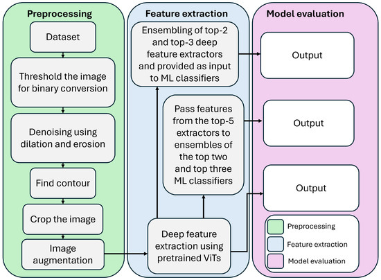 As illustrated in Figure 1, the proposed architecture for brain tumor classification utilizes a multi-faceted approach, integrating DL techniques with ML classifiers to achieve enhanced accuracy and robustness. As illustrated in Figure 2, the process initiates with the meticulous preprocessing of MRIs, a crucial step that encompasses cropping to isolate the region of interest, resizing to standardize the input dimensions for subsequent processing, and augmentation to artificially expand the dataset and improve the model’s generalization capability. These preprocessed images then serve as the input for pre-trained ViTs models, chosen for their powerful feature extraction capabilities, which capitalize on transfer learning to adapt knowledge gained from large-scale image datasets to the specific task of brain tumor classification. The extracted features, representing high-level abstractions of the input images, are then subjected to a rigorous evaluation process using a diverse array of ML classifiers; this allows for a comparative analysis of their performance in distinguishing between normal and abnormal brain tumors.
