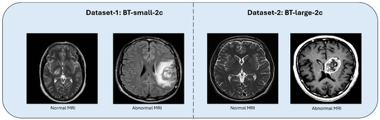 Sample MRI scans (normal and abnormal) from Dataset-1 (BT-small-2c) and Dataset-2 (BT-large-2c).