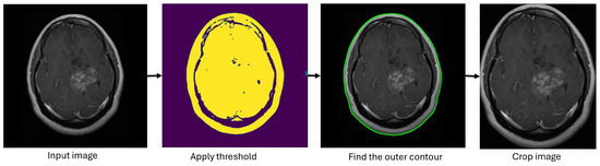 The cropping process for MRI images, illustrated in Figure 4, begins by applying thresholding to convert the images into a binary format, which is followed by dilation and erosion operations to reduce noise. Subsequently, the largest contour is identified in the binary images, and the four extreme points (topmost, bottommost, leftmost, and rightmost) are located. Using these points as a reference, the images are cropped and then resized using bicubic interpolation, which produces smoother curves and better manages the prominent edge noise often present in MRI images.