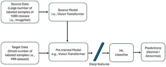 We employed many variants of ViT-based models as DL feature extractors, utilizing their capacity to autonomously recognize and capture essential features without manual intervention. To address the limitations posed by the small size of our MRI dataset, we adopted a transfer learning approach as shown in Figure 5, for developing our feature extractor. Training and fine-tuning a DNN from scratch would not be feasible in this scenario. Instead, we leveraged the fixed weights of each ViT model, which was pre-trained on the large-scale ImageNet dataset, to efficiently extract deep features from brain MRI images. This strategy enhances the efficiency and reliability of our feature extraction process.