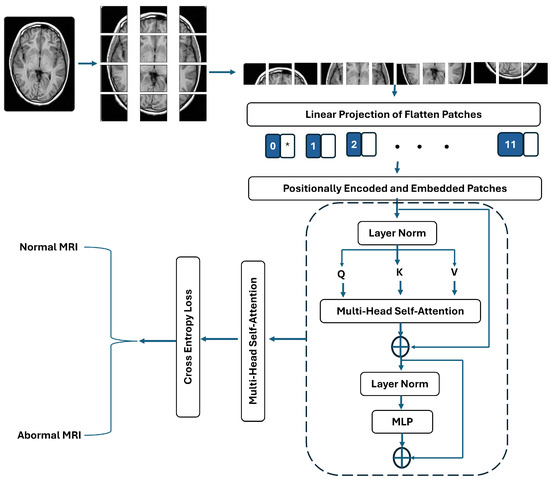 Schematic overview of the ViT architecture for brain MRI classification, illustrating patch embedding, Transformer encoding with multi-head self-attention, and final classification into normal and abnormal categories.